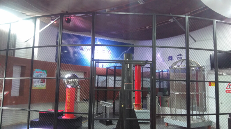 怒发冲冠:本展品是由静电发生器、高压电源和控制部分组成。站上台阶上,左手触摸金属球并保持不离开,当电压慢慢升高达到1万伏左右时,就会发现我们的头发会慢慢地直立起来,宛如怒发冲冠的一般。这是为什么呢?原因是电压在上升的过程中,大量相同的静电荷聚集在了头发上,而同种电荷会相排斥,于是就形成了这种奇特的现象。可是,为什么人站在带有1万伏高压的静电发生器上却不会有触电的感觉呢?这是因为人体和静电发生器是同时升压的,两者之间形成了等势体,之间没有了电势差,也就没有电流流过,人自然就不会触电了。而平常发生触电的情况,主要是因为与人接触的一端是高压线,而另一端是大地,两者之间的电势差非常大,就造成了触电。