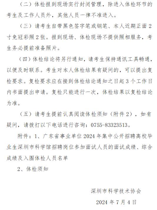 广东省事业单位2024年集中公开招聘高校毕业生深圳市科学馆招聘岗位面试成绩、 综合成绩及入围体检人员名单公告