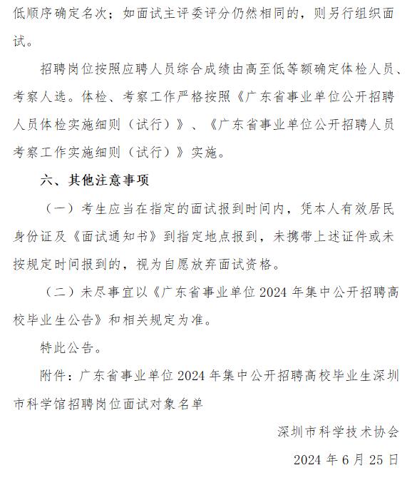 广东省事业单位2024年集中公开招聘高校毕业生深圳市科学馆招聘岗位面试合格分数线及面试对象名单公告
