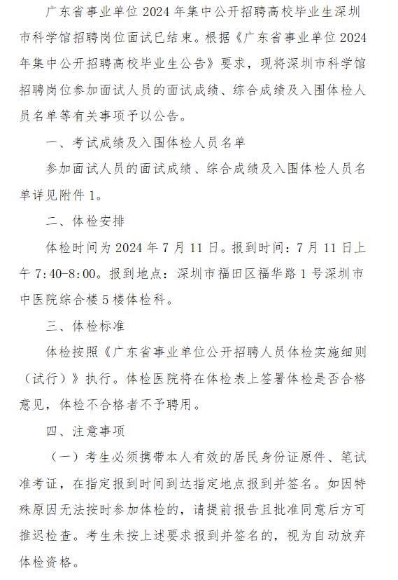 广东省事业单位2024年集中公开招聘高校毕业生深圳市科学馆招聘岗位面试成绩、 综合成绩及入围体检人员名单公告